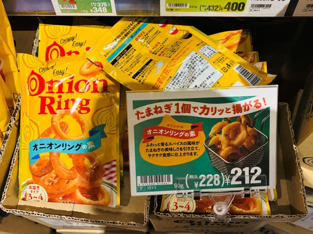穴があいてるからドーナツはゼロカロリーなんて格言がありますが、こちらも同じゼロカロリーなオニオンリングちゃんです!イオンに行ったもんでね、カルディも寄ったんやけどさ