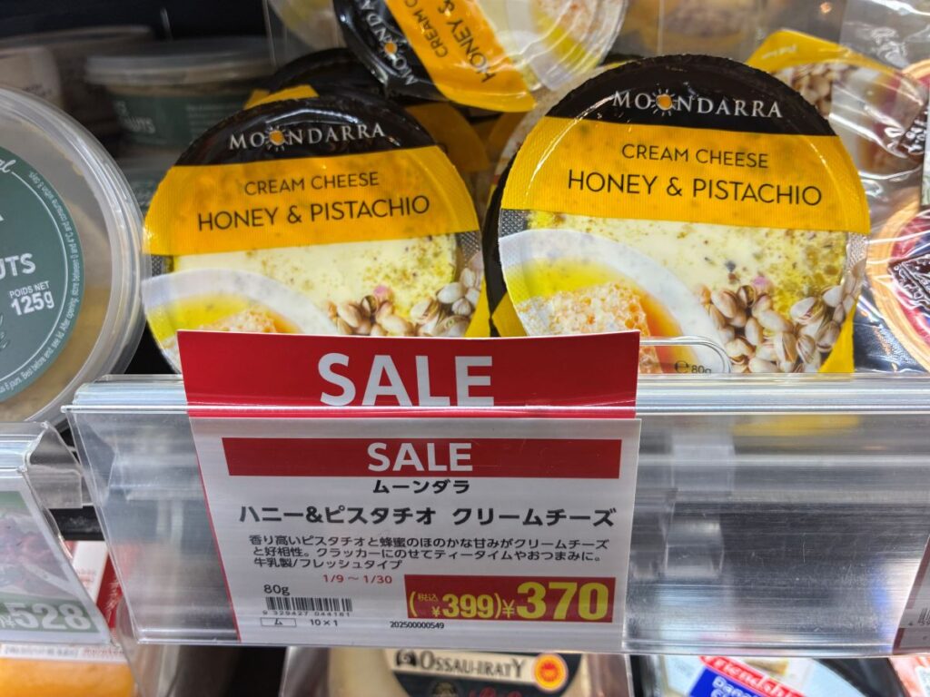 これは冷蔵コーナーのセール品。これはね、正直リピあり!めっちゃ美味しかった❤️ハチミツの甘さにピスタチオの濃厚な感じがクリームチーズと合ってて、箸休め的にばくばくいっちゃう。