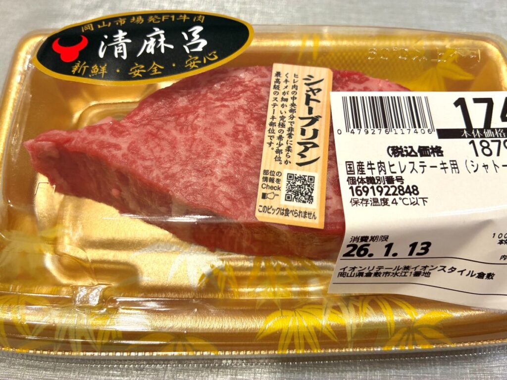 イオンリカーで3,000円弱のワインを買ったのでね、それに合わすのはそれなりのものにしようかと。そっちがシャトー・トゥール・ベルヴュールならお肉はシャトー・ブリアンやと。イオンでこんなお肉買ったことありませんがな。しかも二人分。肉ちっちぇ。