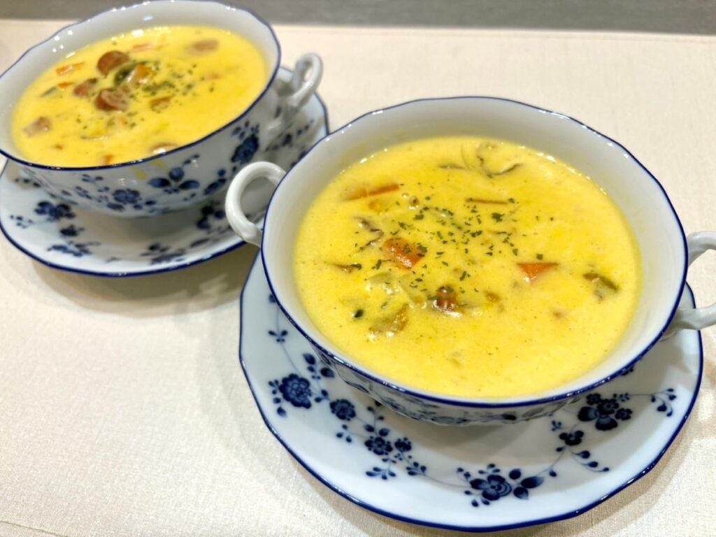 玉ねぎ、カボチャ、人参、ベビーホタテ、ウインナーをコトコトと煮込んだ渾身の一杯!アサリがどうもね、食感がそないに好きやなくて代わりに美味しいダシが出そうなのを探していたらありました。ベビーホタテ。いい仕事してくれましたよ。奥さん。