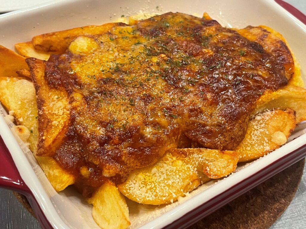青の洞窟のミートソースが100円ちょっとで売ってたから冷蔵庫のジャガイモ揚げてぱぱっと作ってみたゾ!手軽でそこそこ美味しくて良いおつまみ❤️