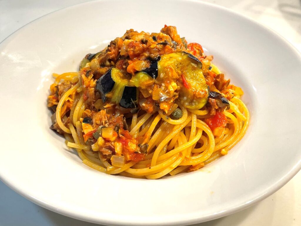 スーパーの商品入替で半額山積みになってた鯖のアヒージョ缶と岡山産のナスをトマトの酸味で爽やかにプッタネスカ風に仕上げてみました。イタリアに似た温暖な気候の瀬戸内の風が口の中にひろがりんぐwww