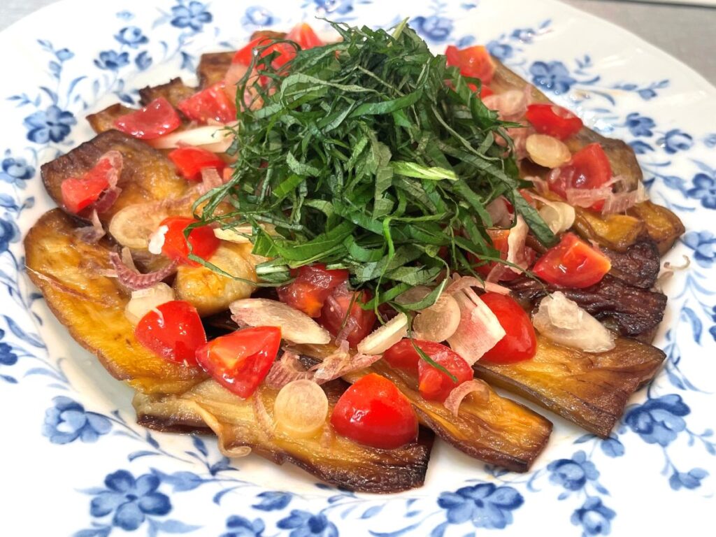 これはね、Youtubeで大人気の中村シェフのレシピ!蒸し焼きにしたナスにミニトマトと薬味たっぷり散らしてバルサミコとオリーブオイルかけて完成のワインに合う前菜❤️