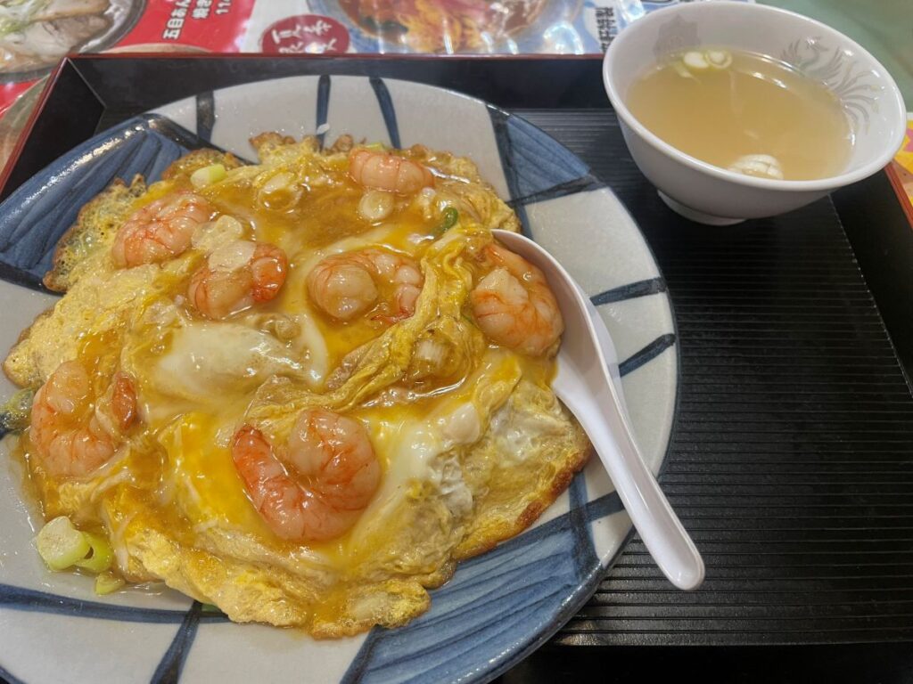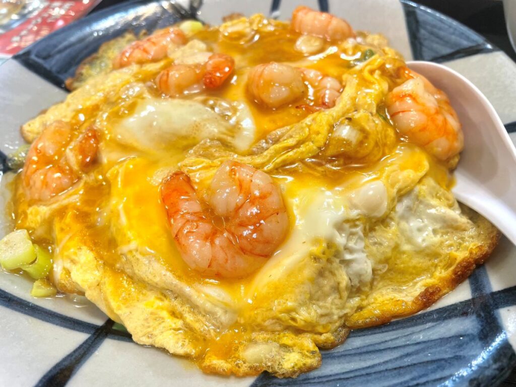 500円玉よりも大きなぷりぷりのえびと刻みネギを玉子で焼き付けてご飯に乗せた、天津飯の様な一品。中華だしで味付けした非常にシンプル味わいながらも、刻みネギの食感と香りのおかげで飽きることなく完食。顆粒の中華だしを使っているのか、たまに味が濃いところが最高に美味しい❤️