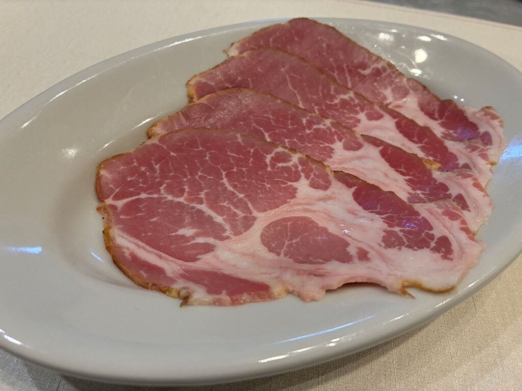 藤井風くんの出身地、岡山県は里庄町にある洋菓子メーカーのサンラヴィアンの直営カフェで購入した、肩ロースの生ハムことコッパ。生ハムていうより割とハム。おもてるよりハム。ちょっとスパイシーで豚の旨味が存分に味わえて、個人的にめちゃくちゃ好きな味やった!これで300円くらいやったからお買い得かも?今回は白やったけど赤ワインと合わせたくなるスパイシーな旨味たっぷりハム🐽